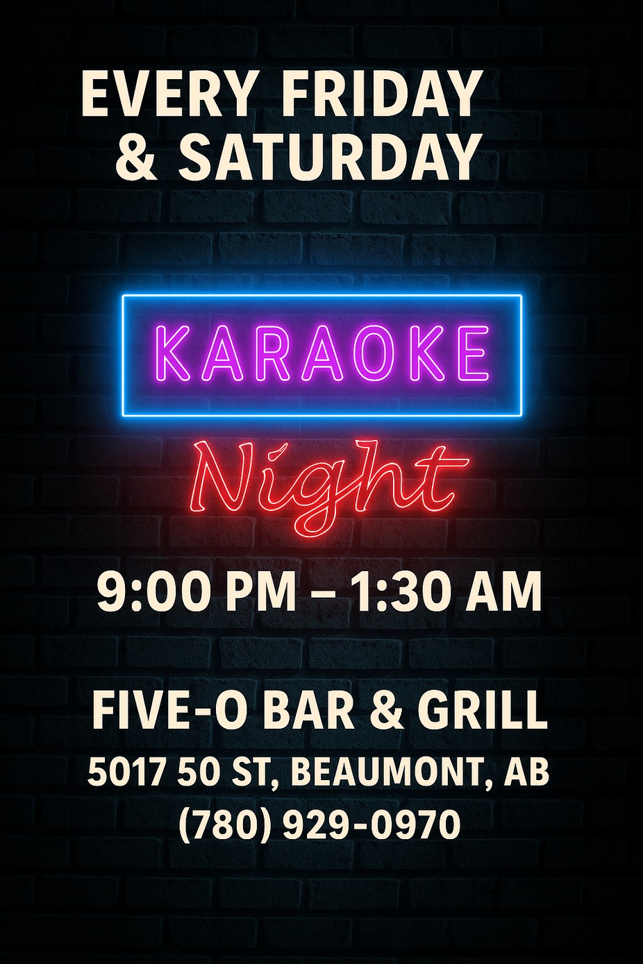 karaoke night every Friday and Saturday 9pm to 1.30am.